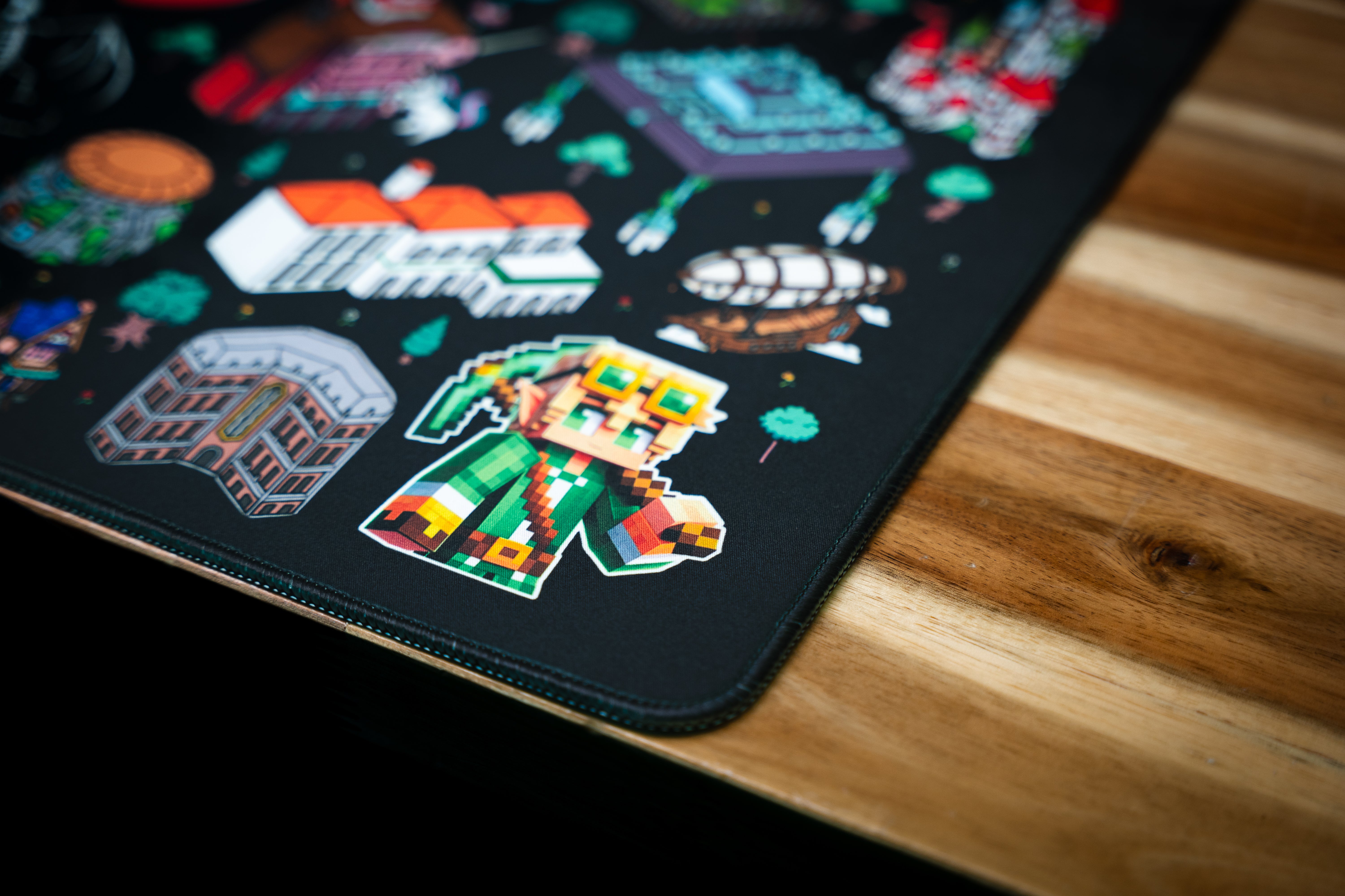 I am very excited to work with Epic Desk, not only is the quality of the mat incredible with very clean and vibrant images on the mat but they also have a very nice grippy rubber underside to hold them in place while you’re gaming. The inspiration behind the design of builders playground are directly from my Minecraft world hand drawn by Whendies, who is a very talented artist.