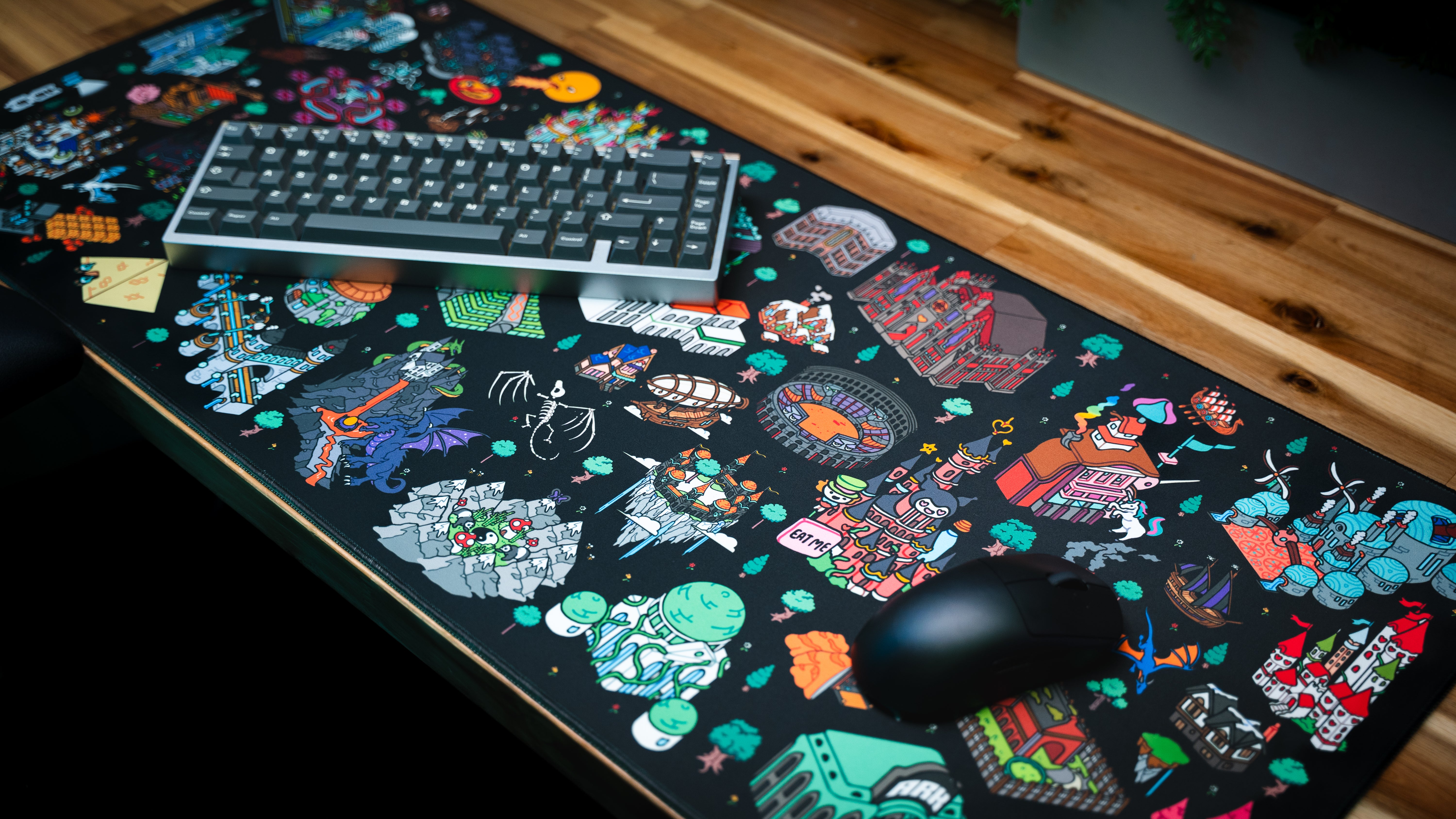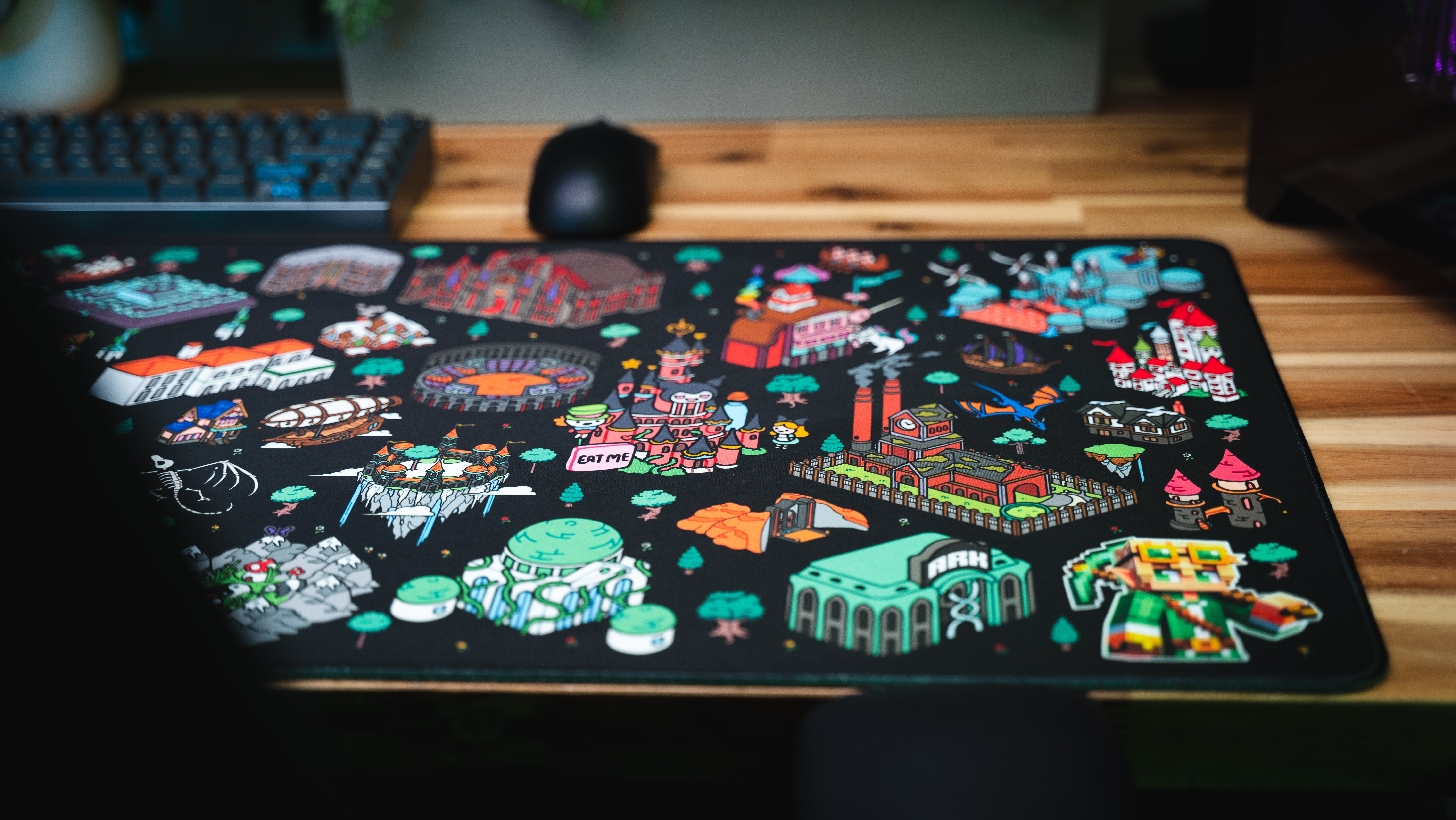 Explore a world of color and creativity with the official Epic Desk x Linkzzey deskmat, illustrated by the talented artist Whendies. This vibrant isometric fantasy map features dozens of whimsical structures, creatures, and biomes, capturing the adventurous spirit that defines Linkzzey’s community. Every corner of the artwork invites discovery, making it the perfect centerpiece for gamers, creators, and fans who love detailed, collectible desk art.