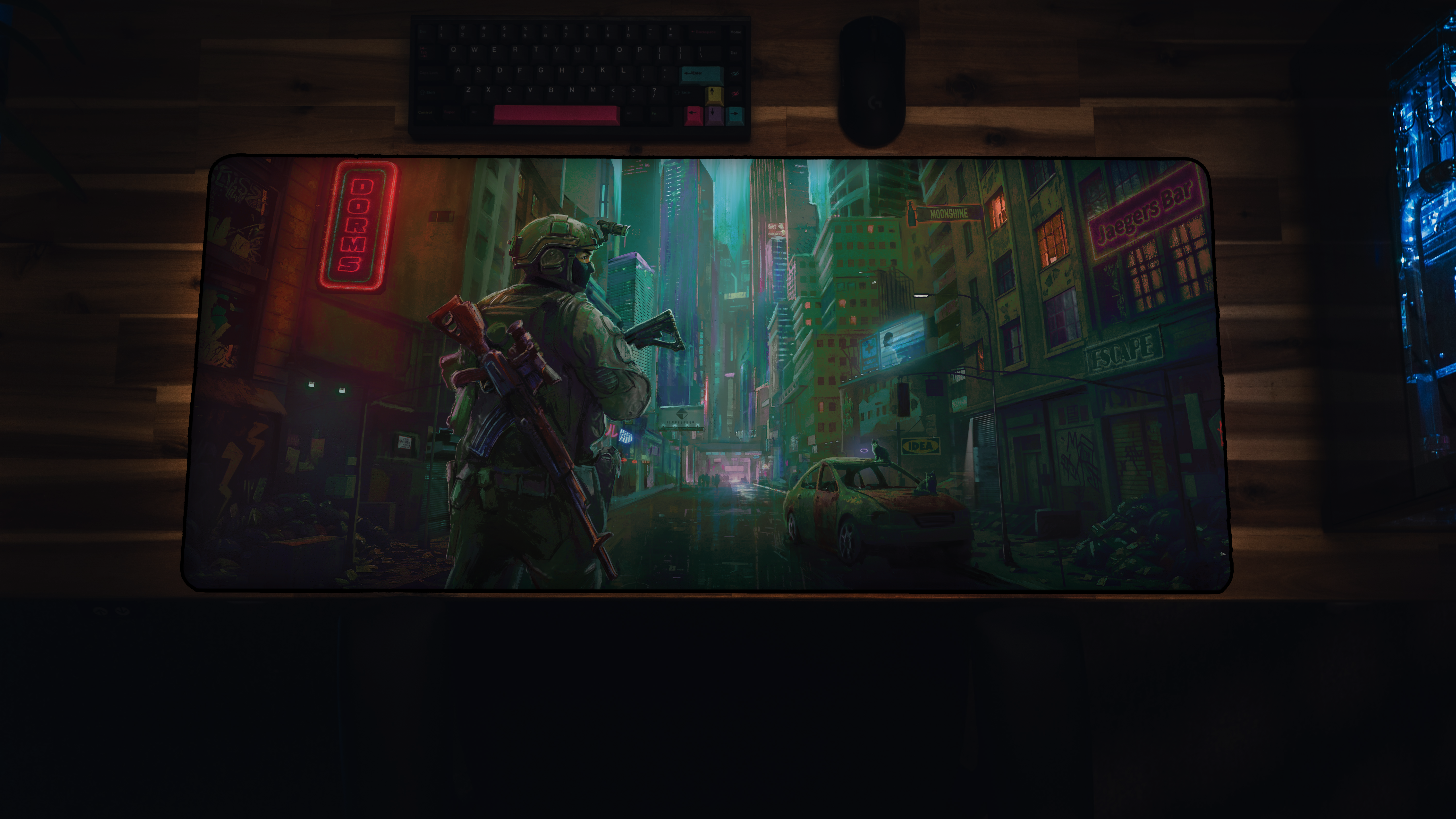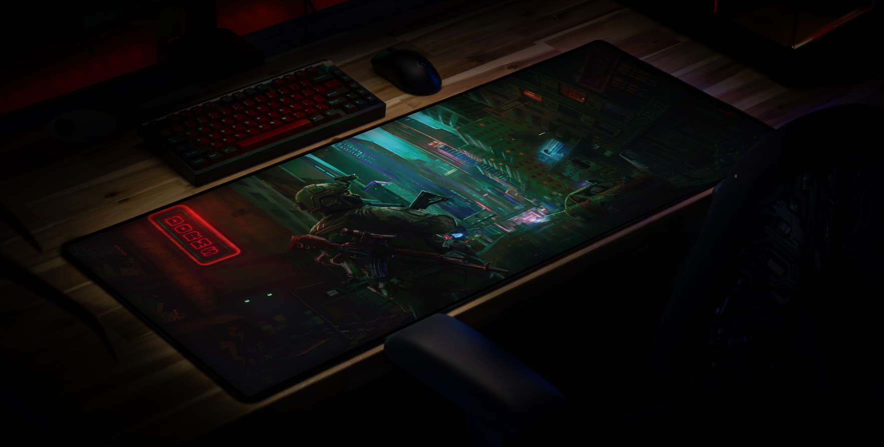 Step into a neon-lit cyberpunk urban wasteland with “Lost”, a premium deskmat from Epic Desk featuring artwork by digital artist Carlos Balarezo. This piece captures the haunting stillness of a lone soldier navigating a collapsing cityscape, vibrant signs flickering overhead, streets soaked in rain, and danger lurking just beyond the glow.