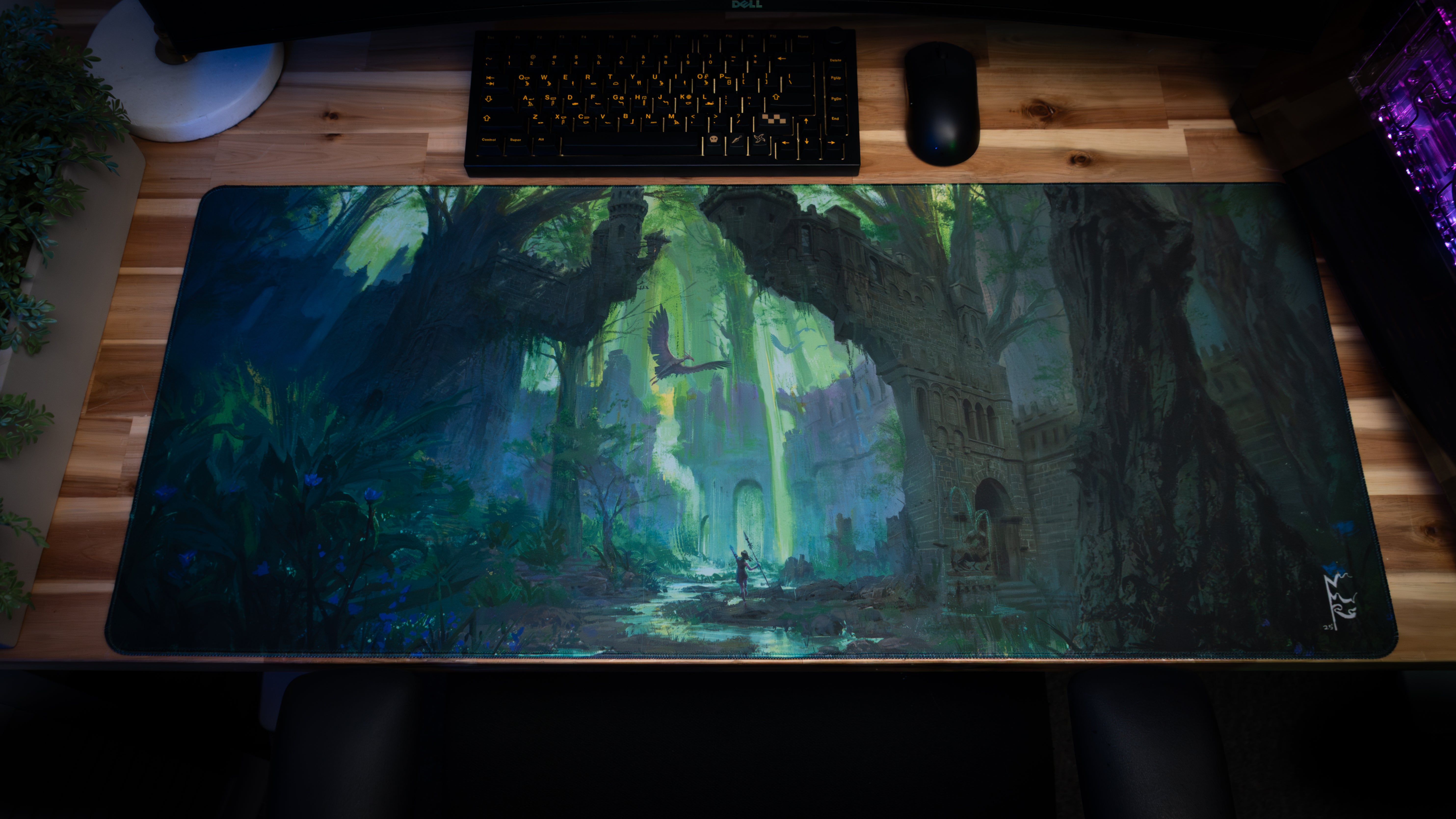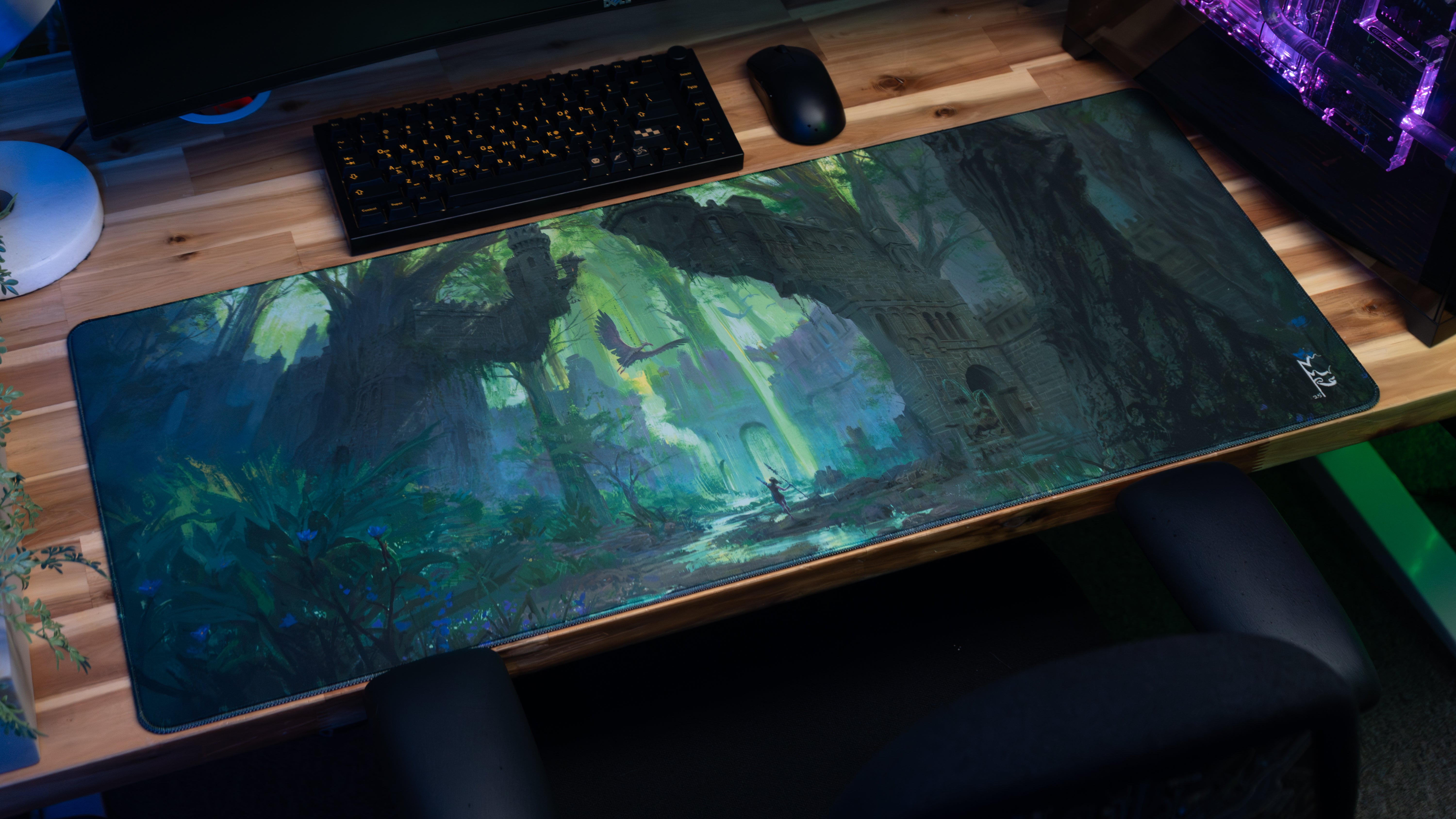 Enter a lush fantasy world with The Huntress, a premium deskmat from the Distant Lands Collection. Created in an official collaboration between Epic Desk and Canadian fantasy artist Nick Ragetli, this piece captures a solitary warrior standing before towering forest ruins as sunlight cuts through ancient stone and emerald canopy. A soaring creature glides overhead, hinting at the mysteries hidden deep within this forgotten realm.