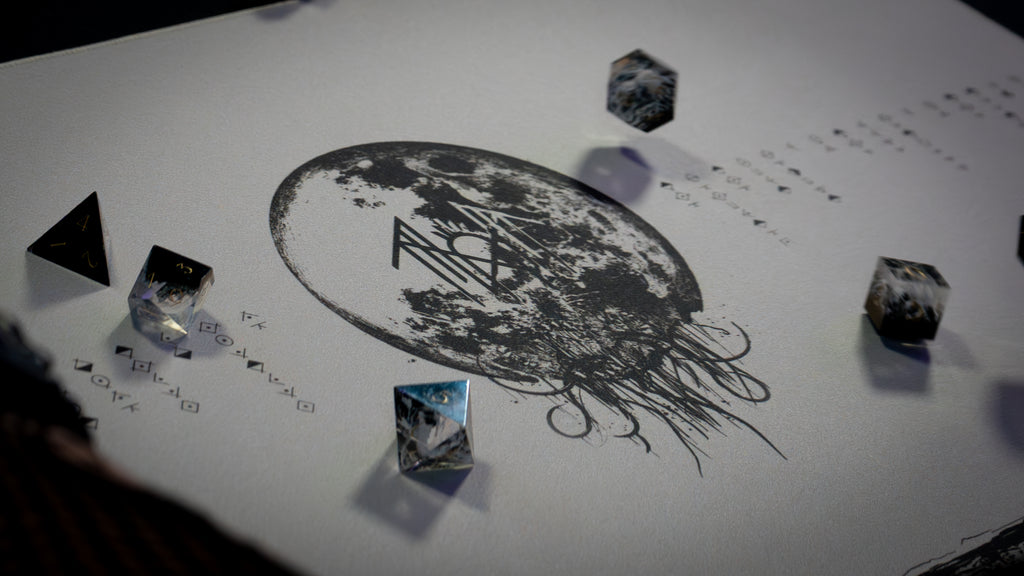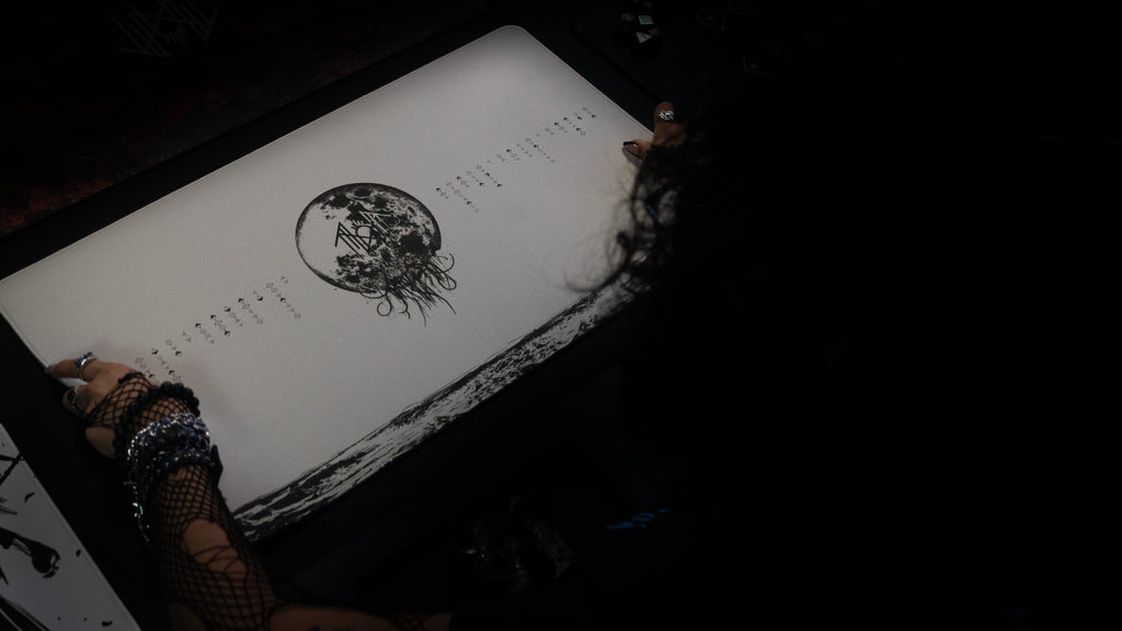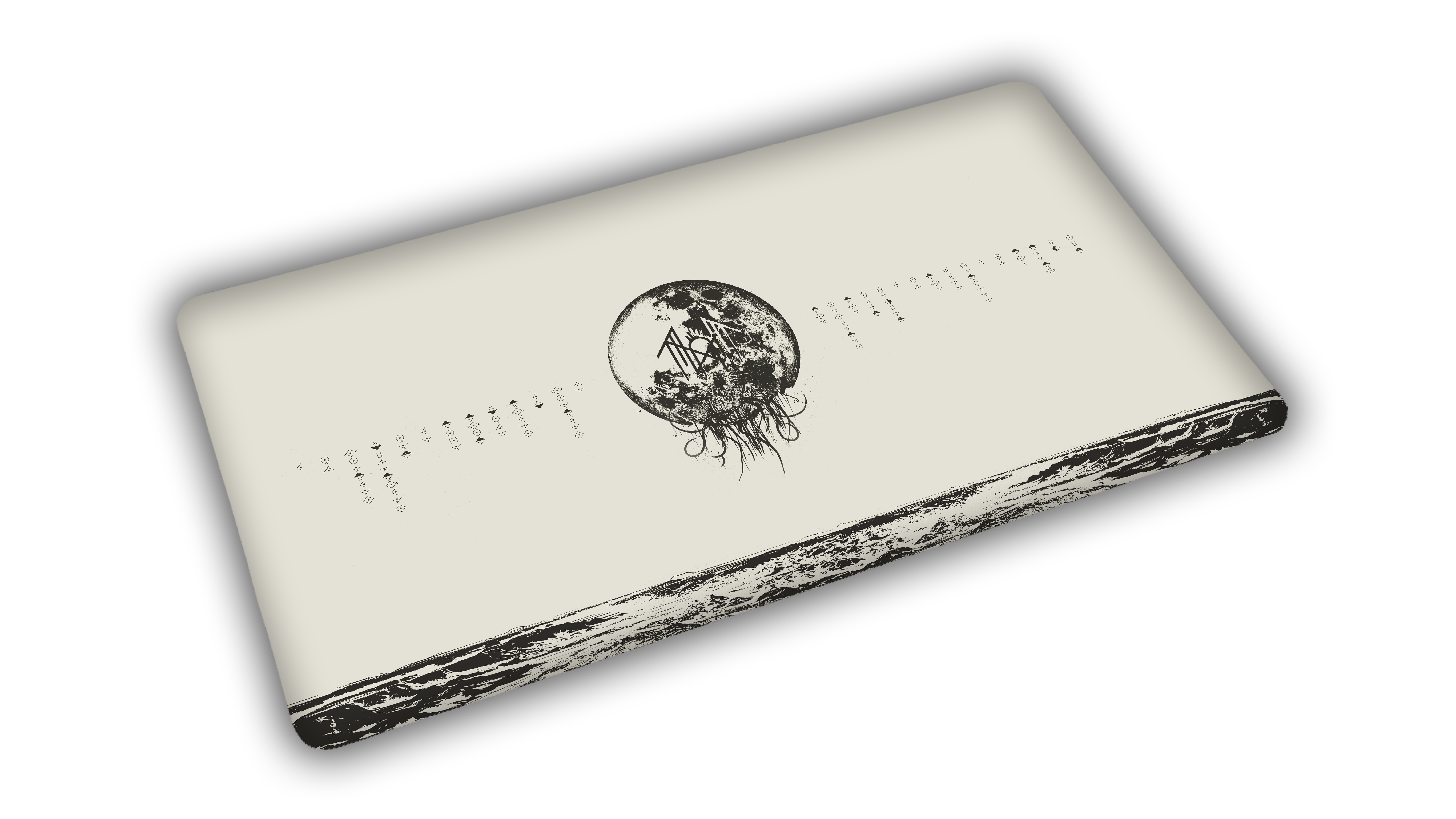 Step into stark, symbolic minimalism with Eeden in Ruin, an officially licensed Sleep Token TCG playmat created in collaboration with Epic Desk. This design features a distressed lunar emblem marked with the band’s sigil, suspended above a fractured landscape rendered in raw black ink. Subtle runic characters drift outward in both directions, creating a quiet sense of mystery and decay. The pale backdrop contrasts sharply with the dark illustration, capturing the desolate beauty and emotional weight seen throughout Sleep Token’s visual mythology.