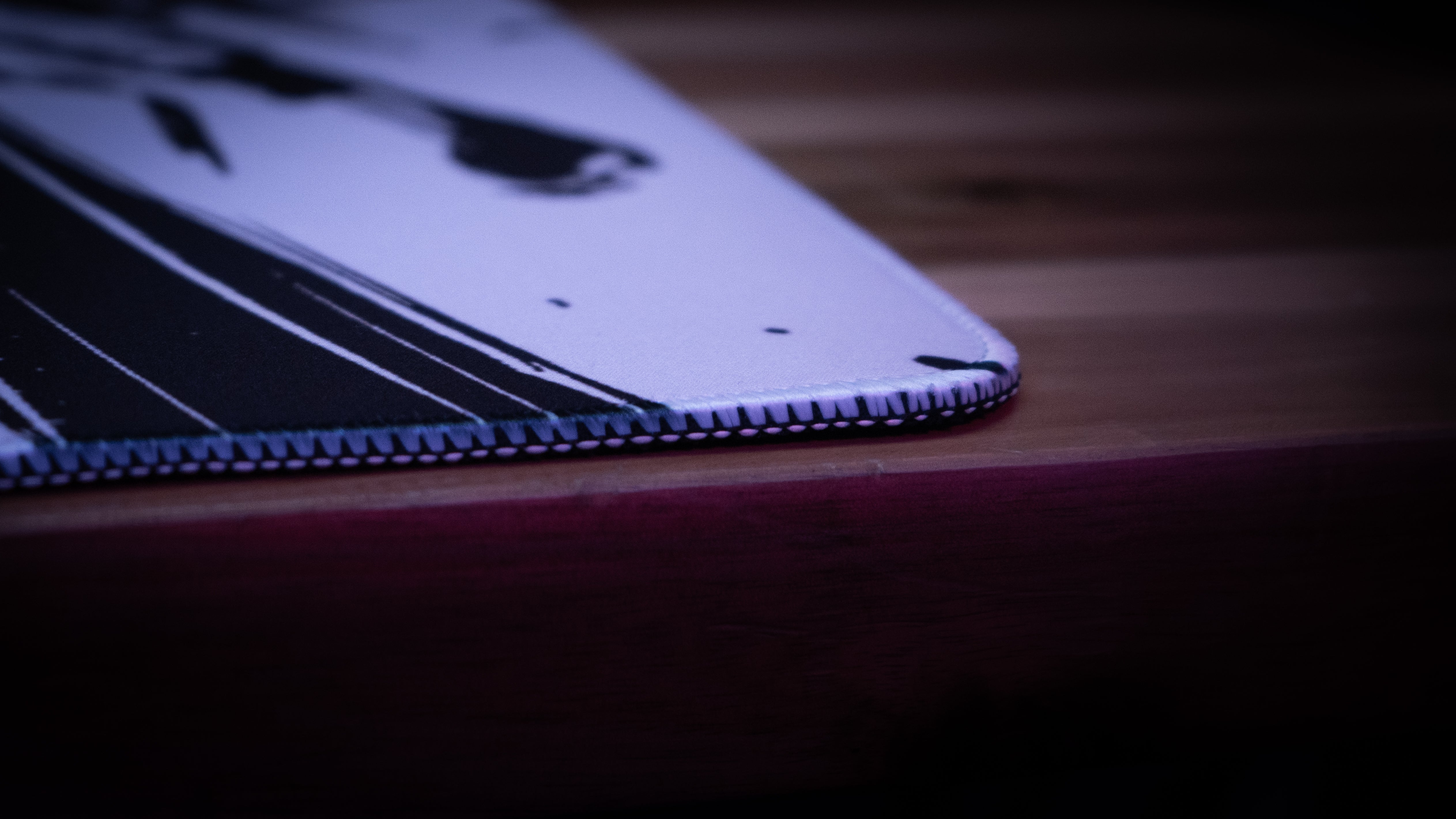 Each mouse pad has sewn edges that aren't raised but rather sits flush. We also use a high quality thread designed to not irritate your skin. Depending on the style of artwork, we will either use a white thread stitched over the artwork or we will do an all black seam around the edges.