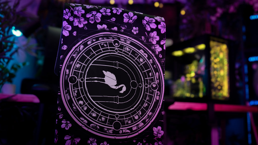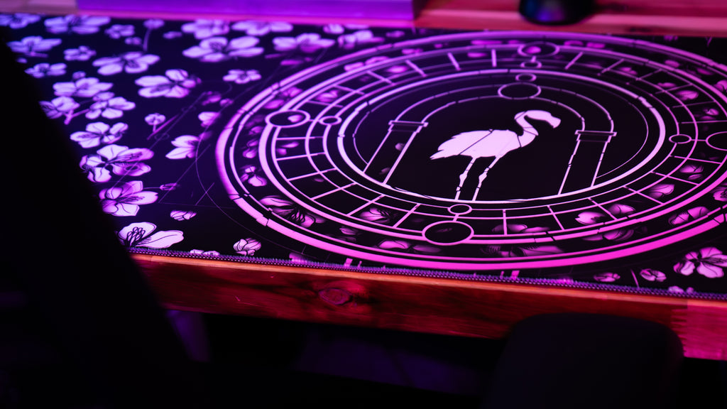 Step into Sleep Token's universe with Programmed to Wilt, the official deskmat that fuses striking Sleep Token artistry with performance-driven design. Featuring a central flamingo motif encircled by intricate geometric lines and framed in delicate floral accents, this piece captures elegance with a surreal edge.