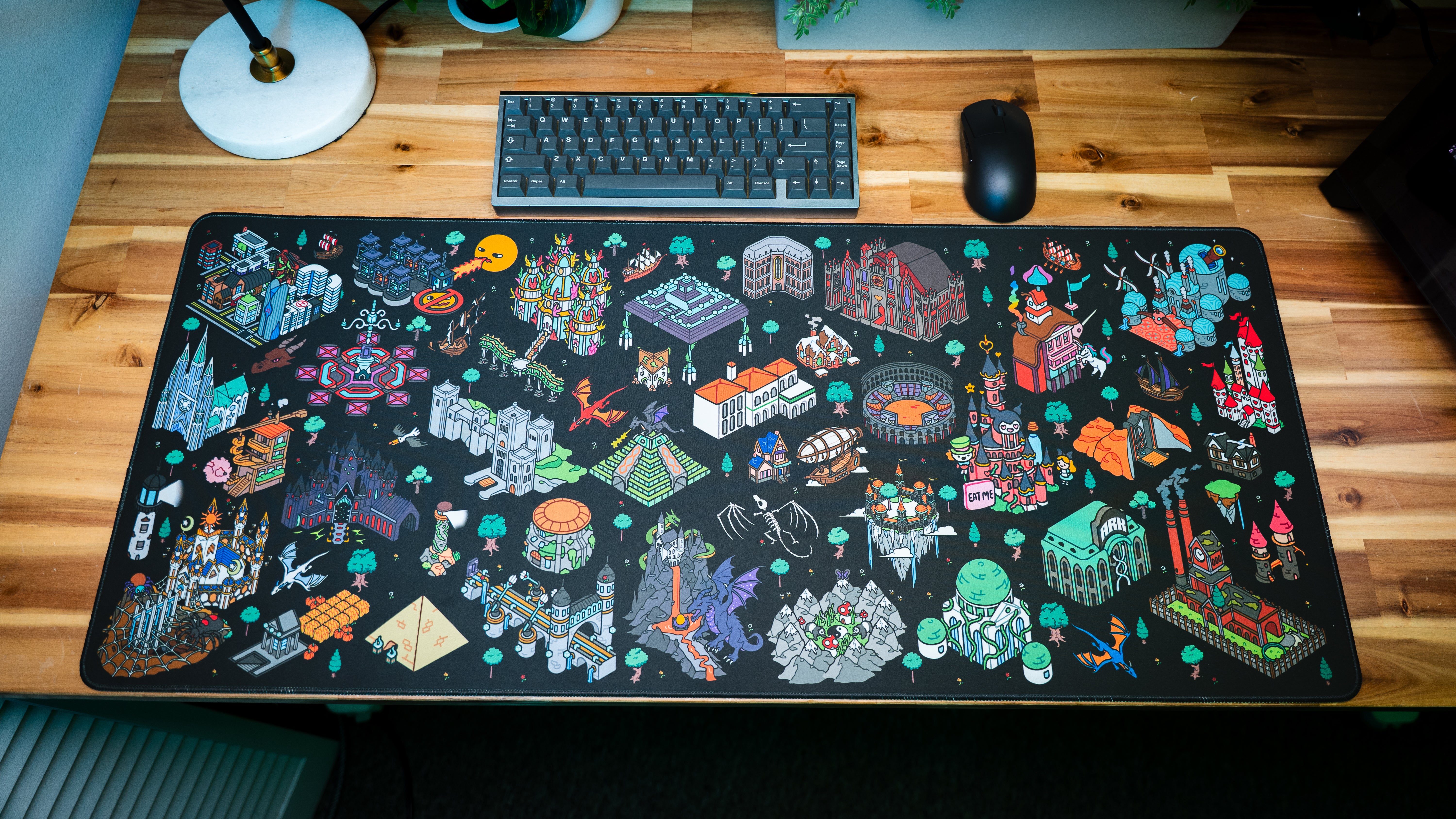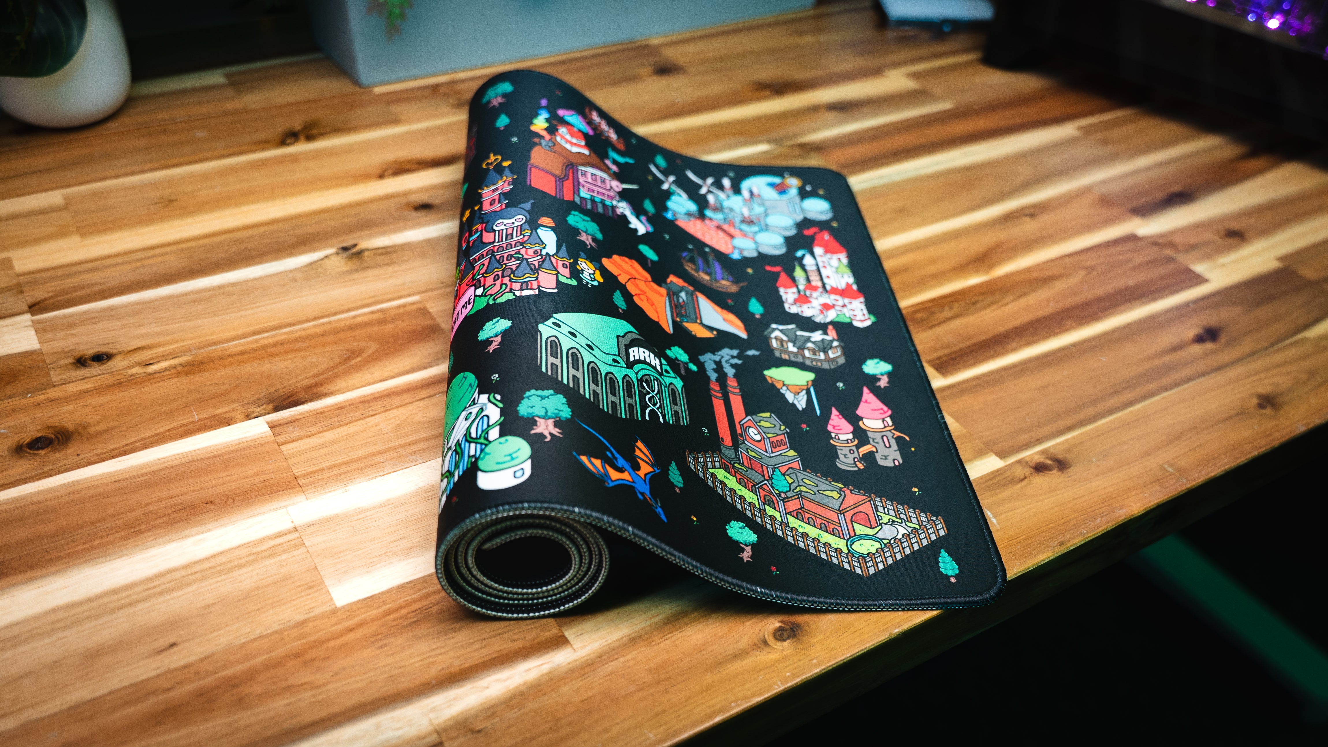 Explore a world of color and creativity with the official Epic Desk x Linkzzey deskmat, illustrated by the talented artist Whendies. This vibrant isometric fantasy map features dozens of whimsical structures, creatures, and biomes, capturing the adventurous spirit that defines Linkzzey’s community. Every corner of the artwork invites discovery, making it the perfect centerpiece for gamers, creators, and fans who love detailed, collectible desk art.