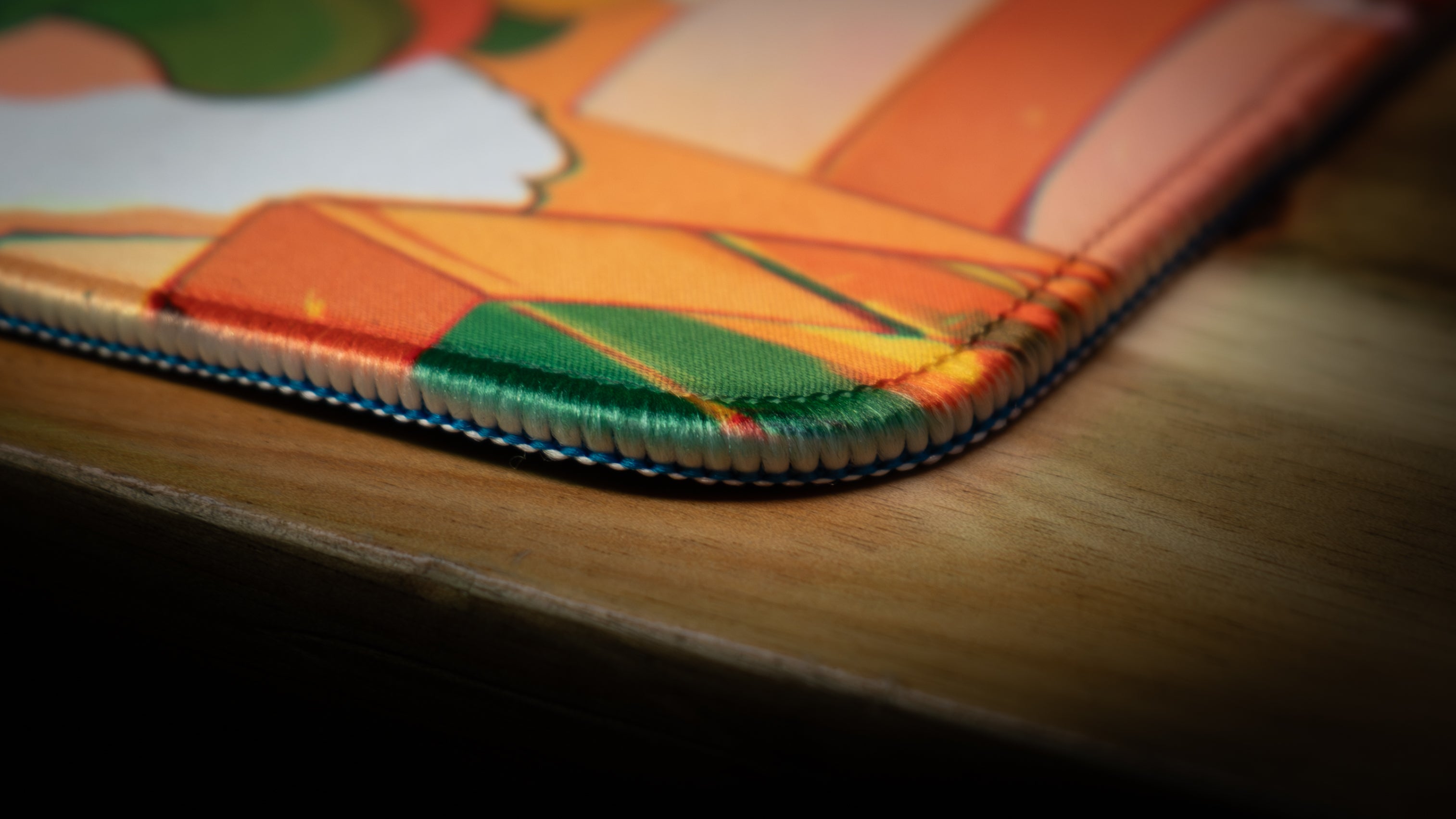 Each mouse pad has sewn edges that aren't raised but rather sits flush. We also use a high quality thread designed to not irritate your skin. Depending on the style of artwork, we will either use a white thread stitched over the artwork or we will do an all black seam around the edges.
