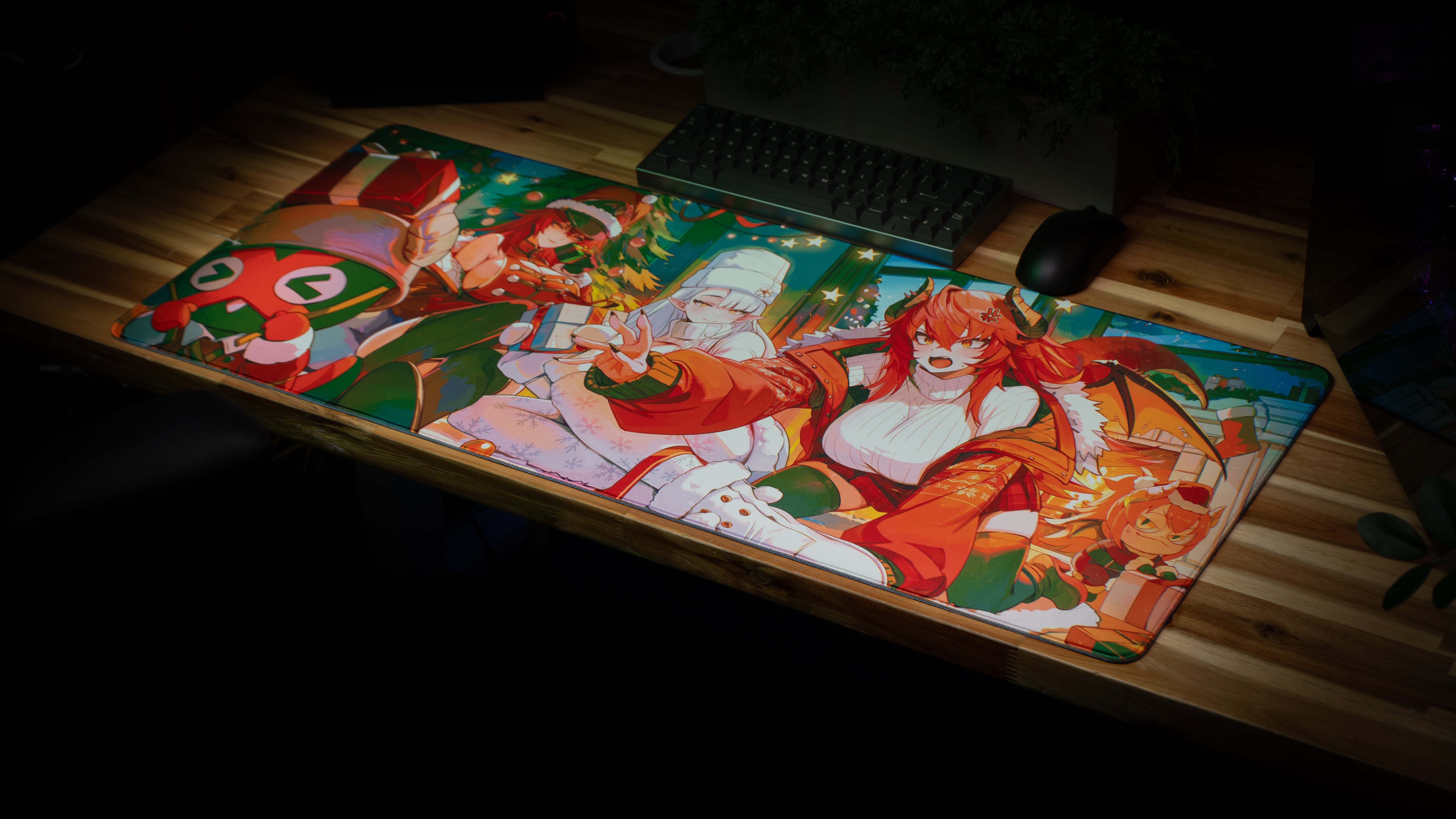 The thought of bringing together Cyber Zentreya, Dragon Zentreya, and General Zentreya all on one art piece is something I’ve wanted to do for a long time. With the redesign of each character completed and the introduction of the newest gecko, I wanted to bring everyone together for the holidays in an exclusive and big piece. Epic Desk was perfect with this as the deskmat is larger than any I’ve ever released before. The quality of the saturation on the colors are deeply rich and present the artwork perfectly, elevating the moment from magical to epic.